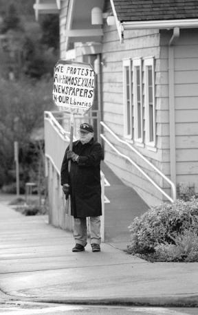 Hoping to bring out a bigger crowd of picketers — as he did in protests at The Clyde Theatre and Langley Middle School in the early 1990s — Rev. Bob LeRoy was alone in his crusade, which drew some stares from drivers and pedestrians but little response. It also did nothing to change the library’s newspaper policy.