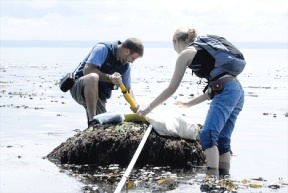 Clinton resident Terry Swanson, a senior lecturer in earth and space sciences at the university, and Heather Rogers, a graduate student of geology, both stood knee-deep in calm water next to a seaweed- and barnacle-encrusted boulder.