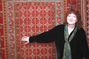 Sharon Lundahl stands before a recently acquisitioned replica of the famous “Pazyryck carpet” on display at Music for the Eyes in Langley.