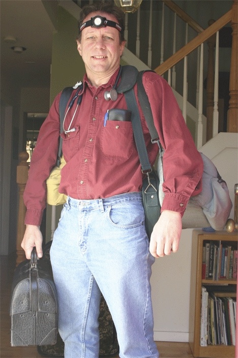 Into several small, ready-to-go bags, Harris has created a veritable doctor’s office on wheels which makes it easy for him to see patients just about anywhere.