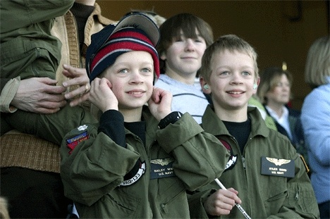 In her right arm, she held their son, Camren, 3, as her twin boys, Bailey and Kyler, 8, put their fingers against their ears as the roar from the Prowlers began to fill the VAQ-133 hangar. All three boys were dressed in green flight suits, just like the one their father wears at work.
