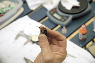 He took the diminutive bird from the bag and carefully pushed its head through a slot in a piece of white cloth, wrapping it up and clipping the fabric closed. He then placed the neat package onto a digital scale; and the bird in hand tipped the scale at 4.6 grams.
