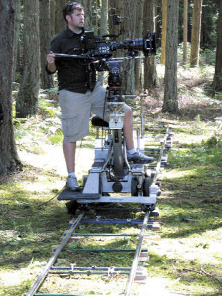 Seattle film crew cameraman Mike Prevette sets up his camera on a 30-foot track in the forest next to Bayview Road Wednesday. Lenz Films was filming a woman bicyclist for an ad showing the health benefits of the Everett Clinic.