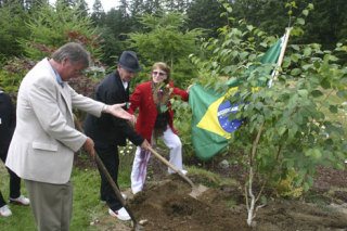 Twenty “green” ambassadors from Brazil joined a like number from Friendship Force of Whidbey Island on Tuesday afternoon to plant an 8-foot white birch outside Langley.