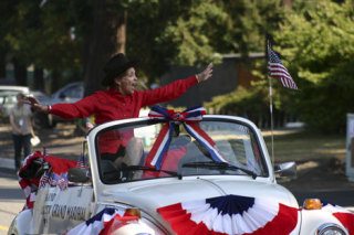 Riding in the back seat of a convertible Volkswagen Beetle, grand marshal Martha Murphy led the start of the Island County Parade under sunny skies this morning.