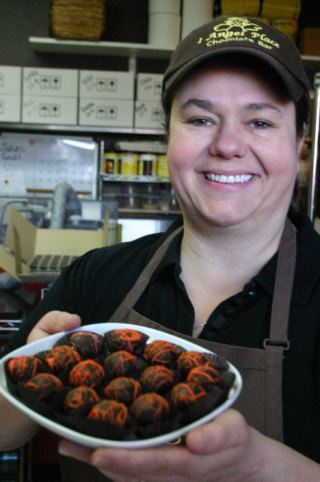 So, step up and get your free truffle: Amore Amaretto, Marzipan Button, Luscious Lemon, Kickin’ Kokonut, Espresso Elegance, Lively Lime, Majestic Milk, Heated Passion — any of nearly 40 varieties made by Newbauer in her little shop on Second Street.