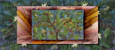 It is with such a large piece, using leaves and their digital images to create a wallpaper of sorts on which Gelfand has placed the life of the madrona through all its seasons, adding her designer’s eye for color and placement, that she has come into her own and married her love of fiber art to her love of that which grows in the earth.