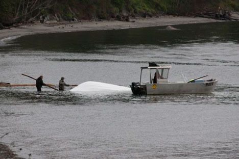 Mike Wiatt of Greenbank, a resident of the area, said three men in a small aluminum boat arrived early Sunday afternoon to retrieve the beached craft. Failing to right the overturned boat, they began towing it semi-submerged toward Lagoon Point as darkness fell, Wiatt said.
