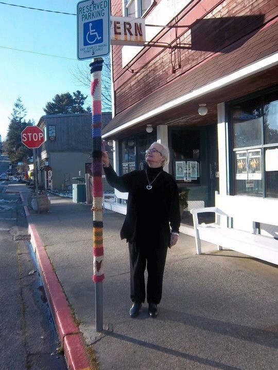 She said she thinks the local “attacks” began about a month or so ago with a yarn cozy on a tree behind Useless Bay Coffee. Another appeared on a tree across Second Street at the South Whidbey Commons, and in other locations around town.