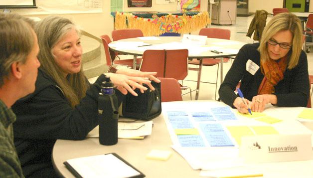 At the front stood South Whidbey School District Superintendent Jo Moccia, reminding the crowd of its tasks, when to rotate tables and asking the assembly to be quiet and listen. At the dozen tables sat about 50 parents, teachers, school board and other community members interested in shaping the future of South Whidbey’s schools.