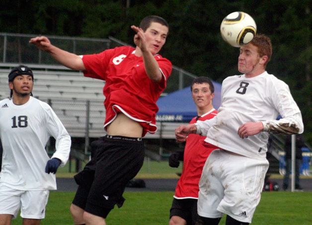 Pouring rain made for difficult passing, especially on long kicks. Both teams struggled with sending the ball from the middle to the goal box. South Whidbey’s coach admitted the field conditions were only part of the his team’s problems.
