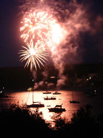 The spectacular fireworks show over Holmes Harbor, set to patriotic music, concludes the evening at around 10:20 p.m. In previous years, about two-thirds of the cost was spent on the fireworks display that included 800 shells fired from a barge in Holmes Harbor.