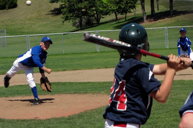 South Whidbey’s Brighton Schott pitches against South Skagit on July 7 in the late innings of the Little League District 11 championship game.
