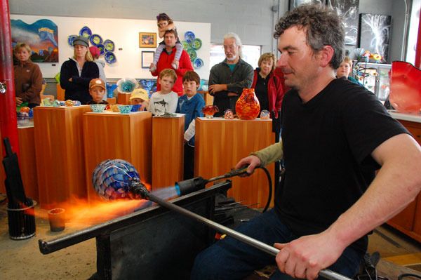 For 10 to 30 minutes, both children and adults can make a variety of their own products — bowls, Texas tumblers, sea floats, etc. — under the personal tutelage of the Whidbey glass master himself.