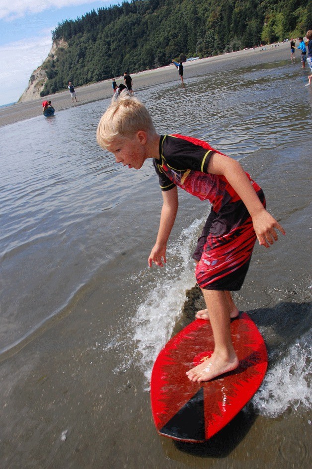 Emmett’s mother, Molly Layman, said her son has tried his hand at skim boarding before. Reiman and others from Jack’d Skimboards are often at Double Bluff, an ideal place due to the huge tide flats, and they never shy from sharing a few tips with her son.