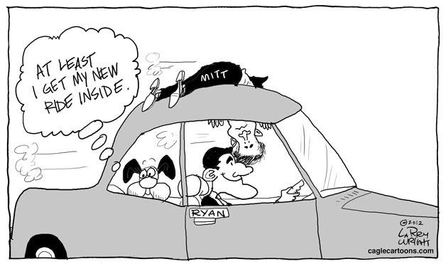 Larry Wright of the Detroit News depicts the Republican presidential candidate's relationship with vice presidential hopeful Paul Ryan.