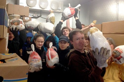 Good Cheer Food Bank volunteers hold up turkeys they are giving away to clients for Thanksgiving. The Food Bank received 500 of the holiday birds on Nov. 9 and will receive another 500 on Nov. 16.
