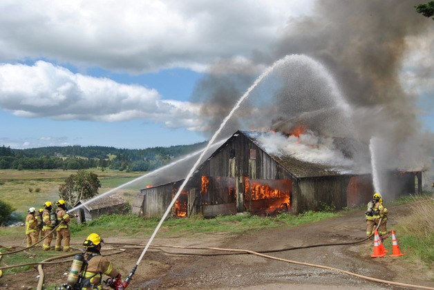 South Whidbey Fire/EMS volunteers take advantage of an old building to practice their water spraying skills.