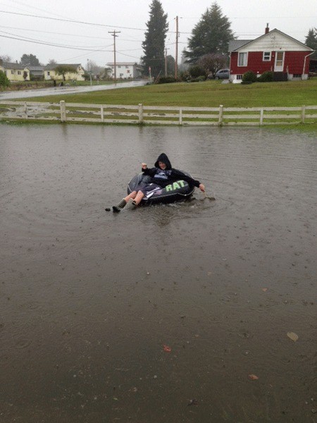 This picture was taken Monday in Clinton on Humphrey Road, near Berg Road. Kellen Boyd, 13, hit the water in his innertube.