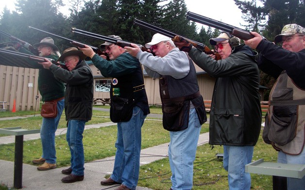 Thursday is clay pigeon practice day at the Holmes Harbor Rod & Gun Club. Displaying their shooting styles from the left are Mike McInerney
