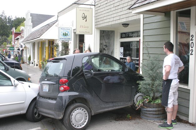 The Smart car crashed against a parked Nissan Sentra in the space next to it, scraping the front passenger-side paneling. The position of the two cars, seemingly tangled, made it difficult for the Smart car to reverse itself off the sidewalk and away from the building. Mike Cotton, deputy chief for South Whidbey Fire/EMS, said it would likely take a tow truck to slide the Smart Car away from the Sentra first, especially since he estimated the Smart Car was not drivable.