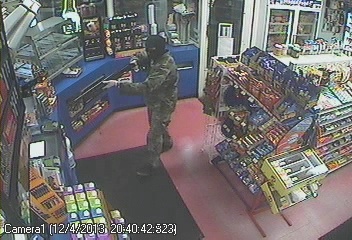 Security footage from the store shows the masked man, believed to be between 5 feet, 10 inches and 6 feet tall with a thin build, pointing a pump-action shotgun at the clerk, who is not visible in the