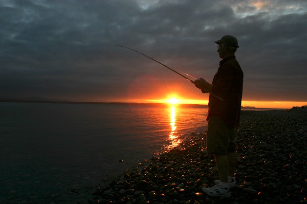 Kevin Lungren fishes from the beach at South Whidbey State Park in August as the sun sets. Though a popular sport on Whidbey