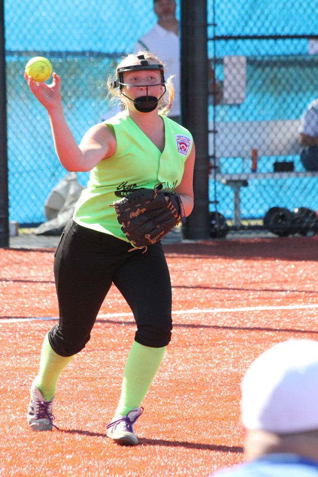 Bella Northup fields a ball and throws out a runner against the Bellevue East/Bellevue Thunderbird/Mercer Island Little League juniors division team on Sunday