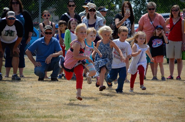 These young speedsters take off toward the finish line in the 3 & younger sprint races at the 99th Maxwelton Independence Day field games on July 4 at Dave Mackie Park.