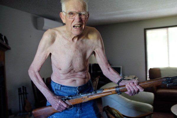 That didn’t stop Olinger, however, from stripping his shirt off and posing with a Japanese rifle for a photo shoot with the South Whidbey Record. He said his intention was to mimic Vladimir Putin, whose shirtless poses have been lampooned internationally.
