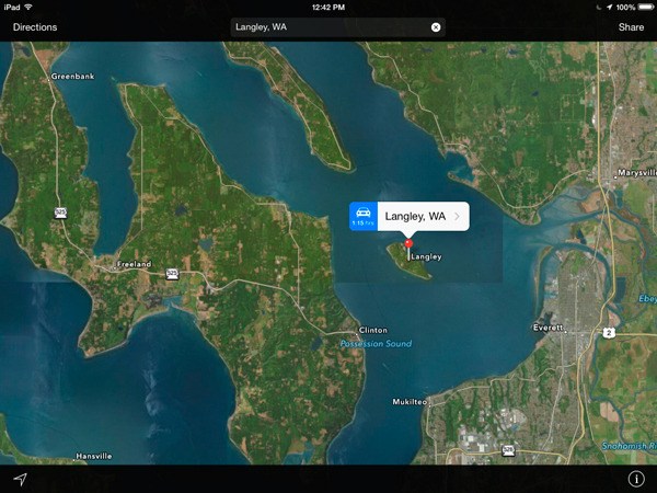 Apple Maps, a navigational program that comes built-in to mobile devices such as iPhones, iPads and laptop computers, currently says Langley and Whidbey Island are both located on Hat Island, a small privately owned isle located in Possession Sound between Everett and South Whidbey. Directions to either destination instruct drivers to take a small passenger-only ferry from an Everett marina to the tiny 1.5-mile-long by half-mile-wide island, also known as Gedney.