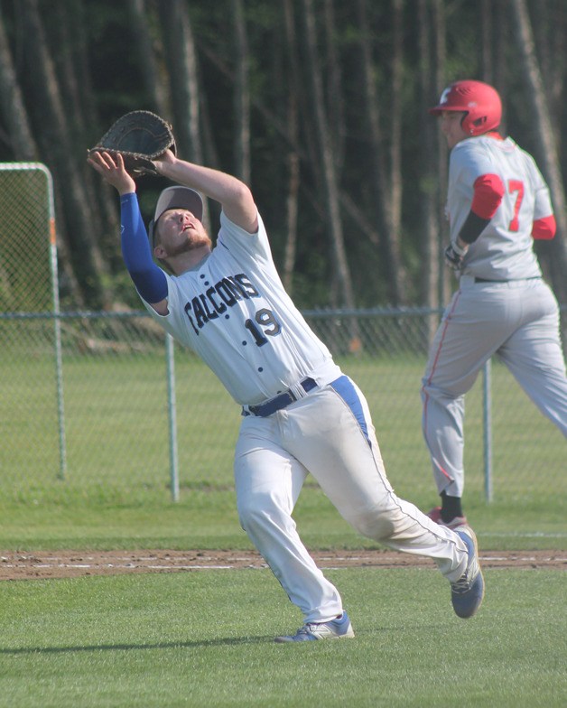 King’s looked poised to sour South Whidbey’s senior day. In the first inning, the leadoff batter knocked a hard-hit grounder to Falcon shortstop Ricky Muzzy, who bobbled the ball and wasn’t able to get the out. The next hitter ripped a line drive that just slipped out of second baseman Connor Antich’s glove as he dove for it, rolling into left field.