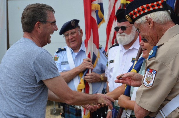 U.S. Secretary of Defense Ashton Carter spends time with Mt. Rainier Post 1889 of the Scottish American Military Society at the Whidbey Island Scottish Highland Games.