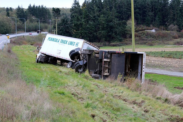 The driver of a semi-truck is OK after his rig left State Highway 20 at Dugualla Bay Farms Thursday morning.