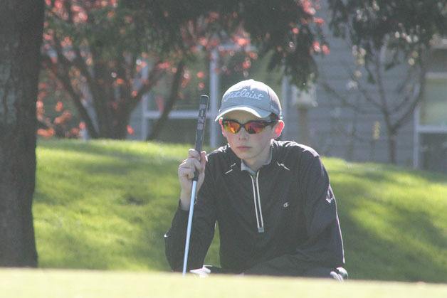 South Whidbey junior boys golfer Ian Saunsaucie plans a putt during Monday’s home match against Cedarcrest.
