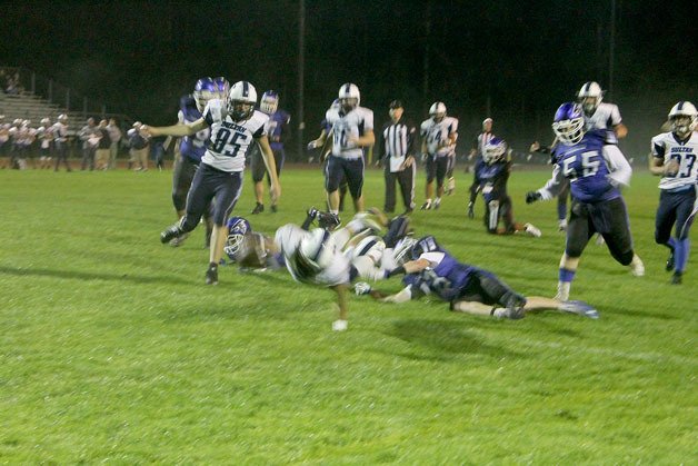 South Whidbey’s game was originally scheduled for Friday, Oct. 14, but stormy weather and a loss of power in the South Whidbey School District forced it to be postponed. Their opponent, the Turks (6-1 overall, 3-1 in league) jumped out to a 13-0 lead with 2:45 left in the first quarter, following an interception thrown by Crain. His intended receiver — junior Hunter Ewart — slipped on wet grass. The Turks capitalized on the turnover when senior quarterback Andy Sam rushed 20 yards for a touchdown.