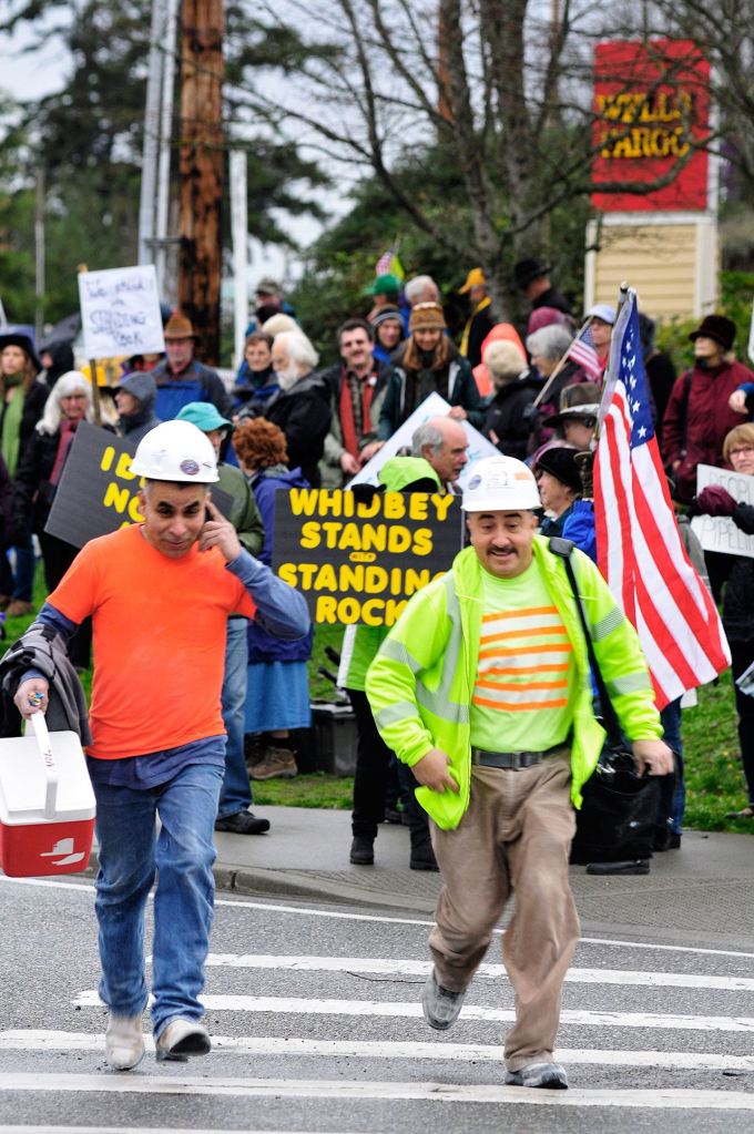 Wells Fargo is one of the 17 banks funding the Army Corps of Engineer’s pipeline project, according to Coupeville resident Lori Taylor, a lead organizer of the local demonstration. A branch is located on the corner at the same intersection.