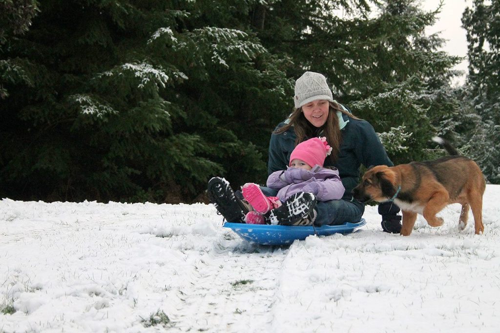 The opportunity to make snow angels and incite snowball fights was increased due to South Whidbey School District schools starting two hours late. Some South End residents used the time to head over to Community Park with their little ones and dogs to take advantage of the steep hill near Castle Park, which is perfect for sledding. For one German Shepherd puppy named Rason, this was his first time seeing the falling white powder.