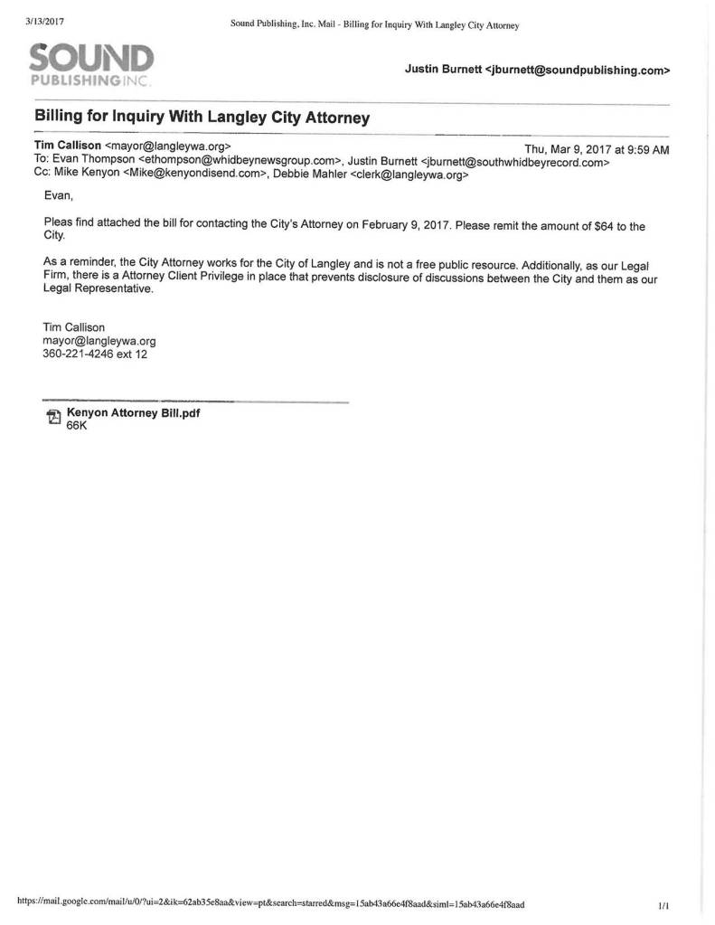 “As a reminder, the City Attorney works for the City of Langley and is not a free public resource,” Callison wrote in his email. “Additionally, as our Legal Firm, there is a Attorney Client Privilege in place that prevents disclosure of discussions between the City and them as our Legal Representative.”