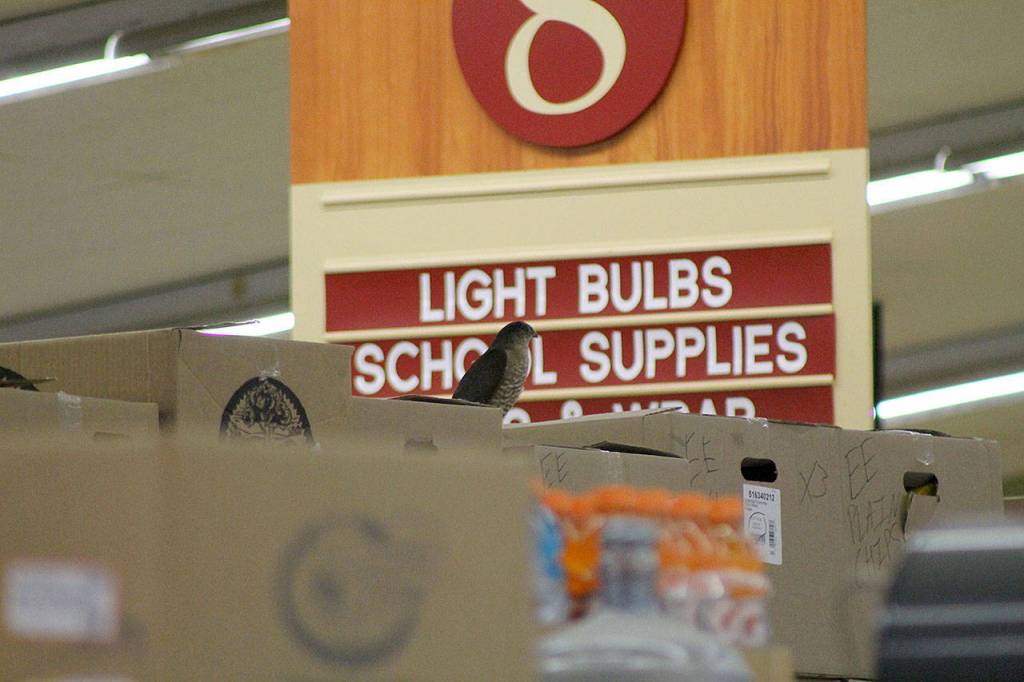 The bird flew into the store about 10:15 a.m. and spent the rest of the day swooping over customers’ heads and sitting perched on aisle signs and other locales around the store.