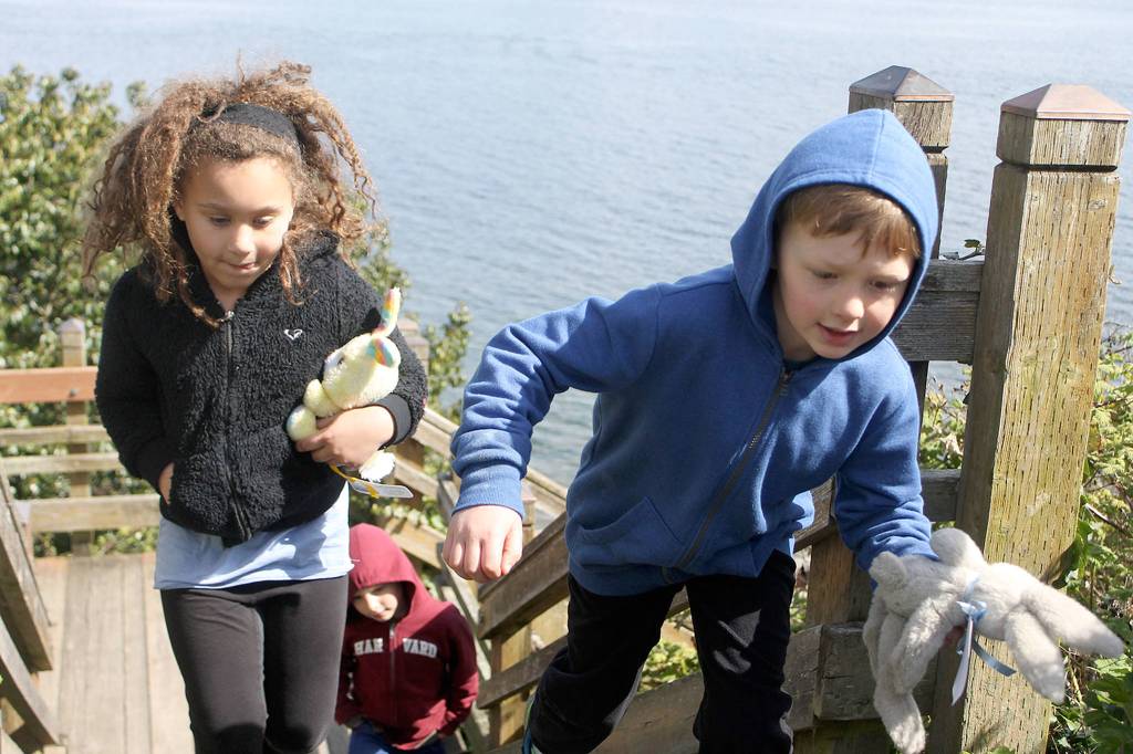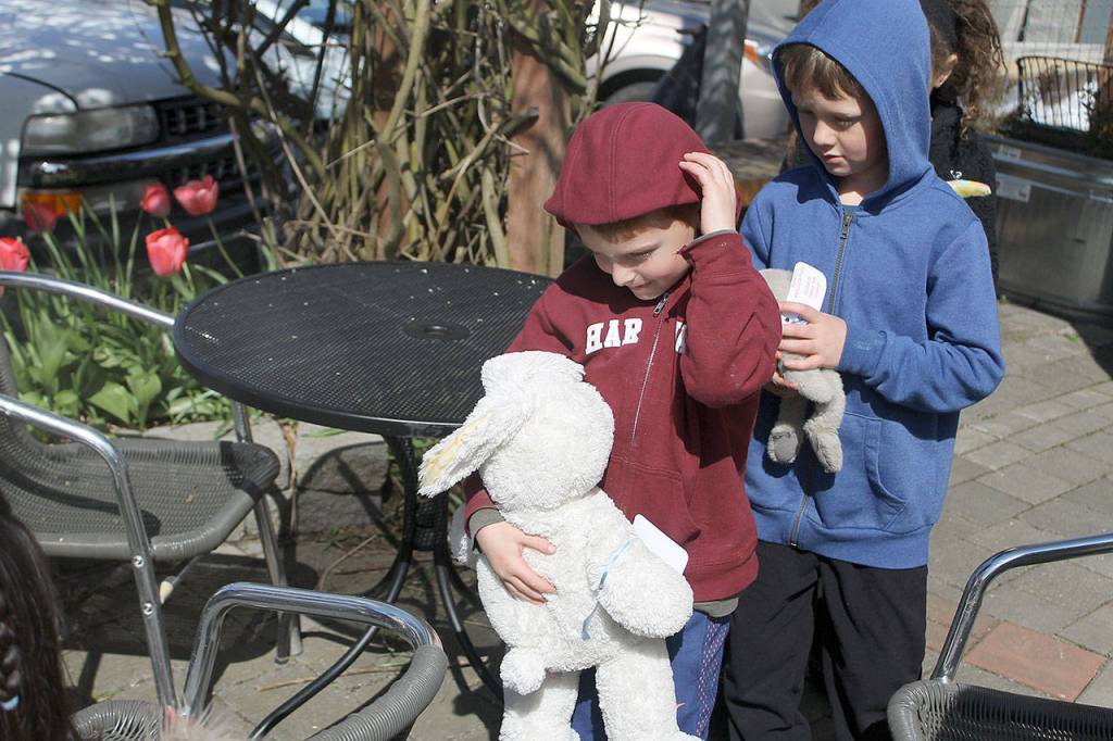 Walsh’s two companions, Wyatt’s older brother Beckett and their friend Matiyah Frasca, found two of the stuffed animals at South Whidbey Commons and were eager to help Wyatt, 6, find one of his own. They were among 300 people vying for 150 bunnies scattered throughout downtown in the second annual event put on by the Langley Main Street Association.