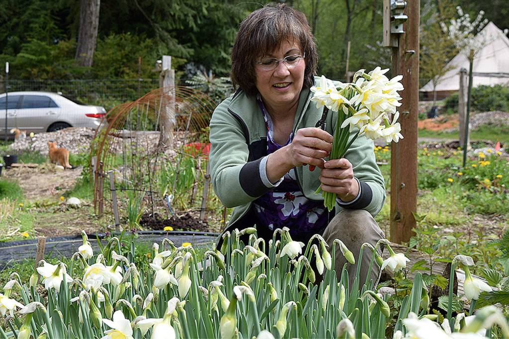 Kyle Jensen / The Record — Sonshine Farm co-owner Pam Uhlig picks daffodils in her Langley garden. Her farm has seen roughly 300 percent growth in the past three years as the locally-grown flower industry continues to grow.