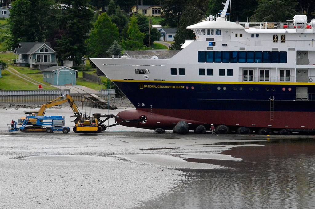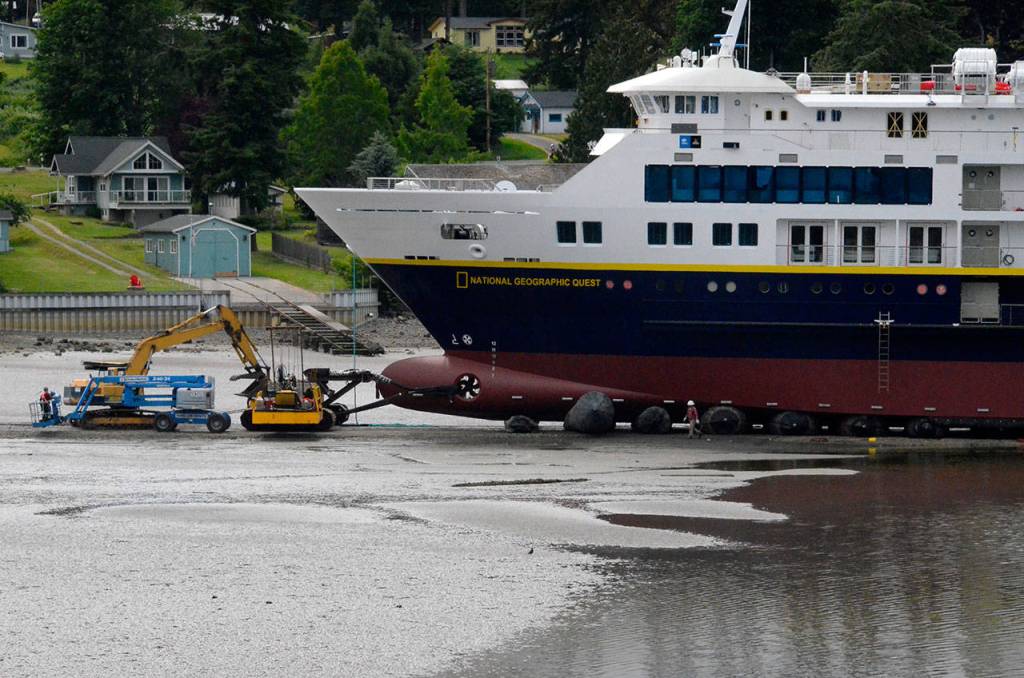 The $48 million vessel, the National Geographic Quest, was successfully floated Wednesday night following a five-day launch and towed to Anacortes for final outfitting. It’s one of two identical vessels the Freeland shipyard is building for marine-based travel company Lindblad Expedition Holdings, which works in partnership with National Geographic.