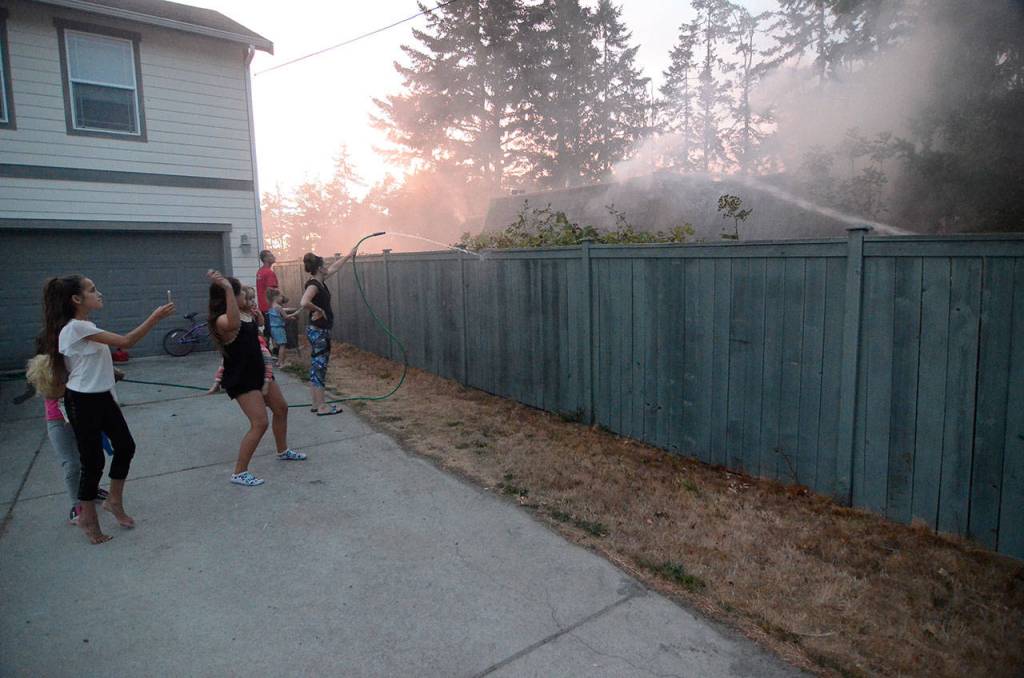 Neighbors Mark Tucker and Amiee Brookhart live in the home next door. As firefighters worked to put out the main blaze, they were busy soaking their fence and lawn with garden hoses.