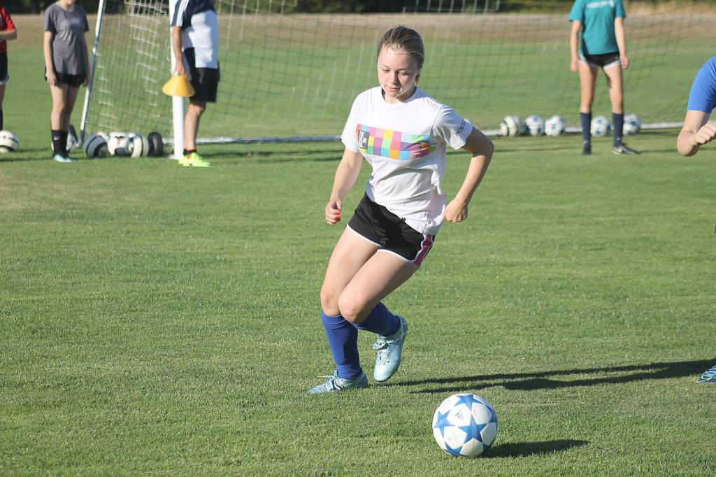 The Falcons trained with several three-on-three drills during the first week of practice. The small numbers are by design; if there are fewer players in any given drill, Swanson says the girls will grow far more comfortable with handling the ball as well as stealing it back from their opponents as opposed to a larger exercise where they may not come into contact with the ball as much.