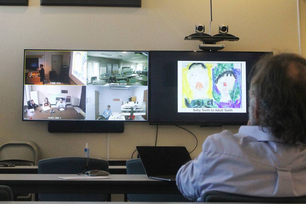 One of the LED screens shows the professor speaking, along with students from other satellite campuses, one as far away as Wenatchee. The second screen displays a slide presentation document to track the subjects being discussed. During a weekly seminar on Monday afternoon, students from three satellite campuses took a class focusing on parasites on and in humans. The class, called “You are a meat stick and that’s OK,” was taught by a professor in a classroom from the university’s main campus in Pullman.