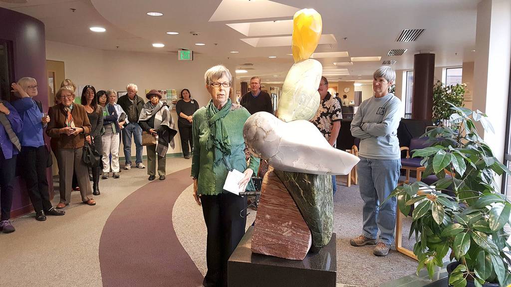 The sculpture is called “Hearts” and was crafted by Sue Taves, a Whidbey Island sculptor. Joann and Art Peterson, along with their friends and family, raised funds to commission the piece for it to be placed in the lobby.