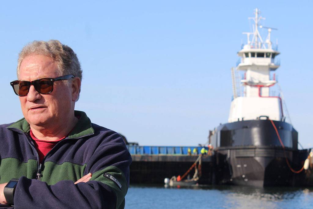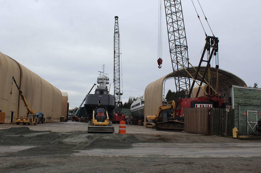 In the middle is a sparkling black and white articulating tug boat squeezed in between two blue barges. It’s been under construction for about a year behind the simple wooden fences of Nichols Brothers Boat Builders on Cameron Road in Freeland.