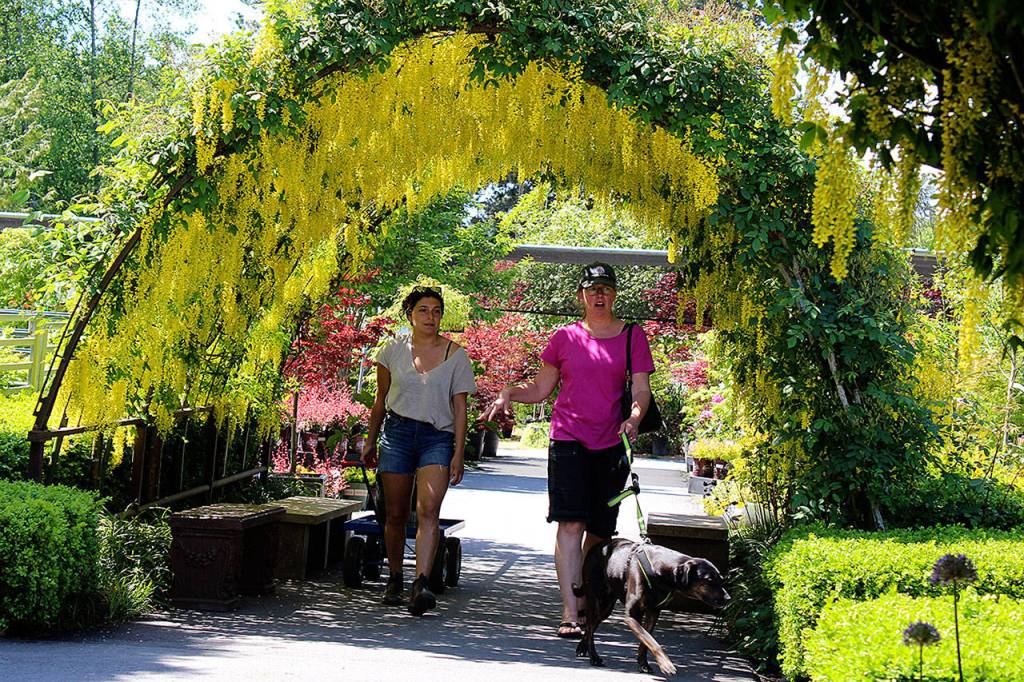 Flowing like golden waterfalls, the long, arched tunnels of blooming laburnum branches put on a spring show seldom seen — or sniffed — at other nearby nurseries.