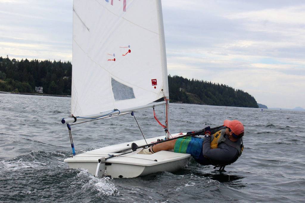 Zak Malbin leans back for optimal speed on a Laser class boat during a race in Holmes Harbor. Photos by Patricia Guthrie/Whidbey News Group